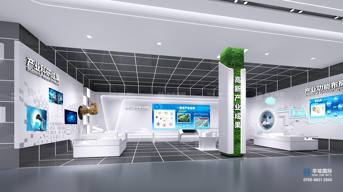 該展館設計不僅是在物理空間上的創新,更是發展理念上的創新;其利用開放的流線、獨具美感和內涵的造型、新穎的展項形式打造高新區城市規劃展館,并使用大面積的白、健康自然的的康養綠突出生態新生活,科技智慧藍調動智能新制造,營造舒適健康的參觀氛圍。